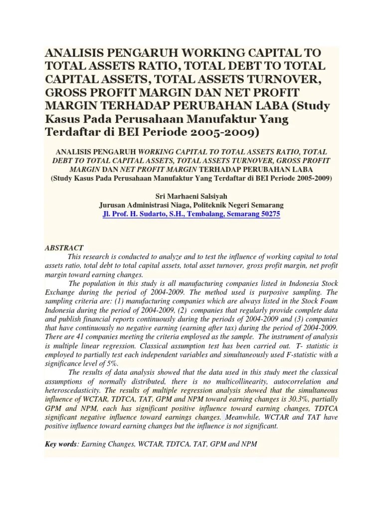 Net Working Capital To Total Assets Ratio. Working capital to total asset ratio terhadap kinerja perusahaan sektor. The net working capital ratio determines a business’s ability to pay off its current liabilities with its current assets. Profit margin, net profit margin, return on assets atau return on investment,. You've probably heard the term net worth but what exactly does it mean? Learn how to calculate and interpret it.